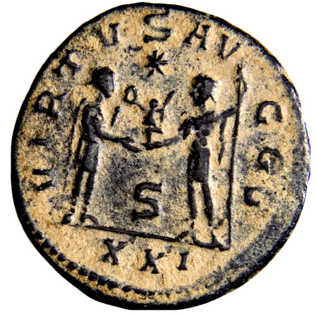 NUMERIANUS Augustus (282-)283-284. AE-Antoninian 4.51g, Antioch, 9 Rev. Armored Bust with Strkr. No. IMP C M AVR NVMERIANVS P F AVG / VIRTVS A-VGG Numerianus presented to Carus Victoriolaglobus; in the field */S; below XXI. RIC 466. .
